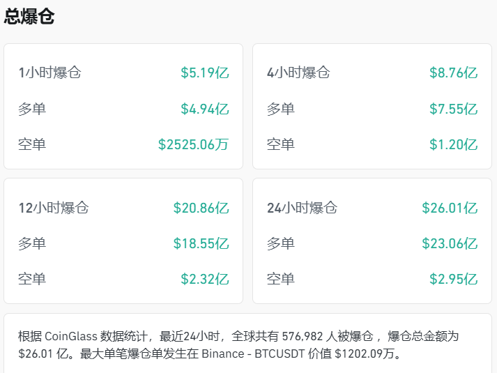 根据CoinGlass数据统计,最近24小时,全球共有57.7万人爆仓,爆仓总金额为26.01亿美元。最大单笔爆仓单发生在Binance-BTCUSDT价值1202.09万美元。